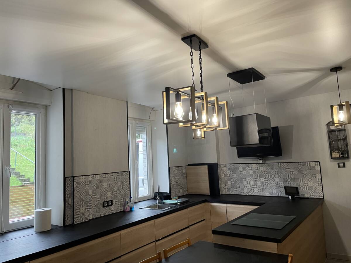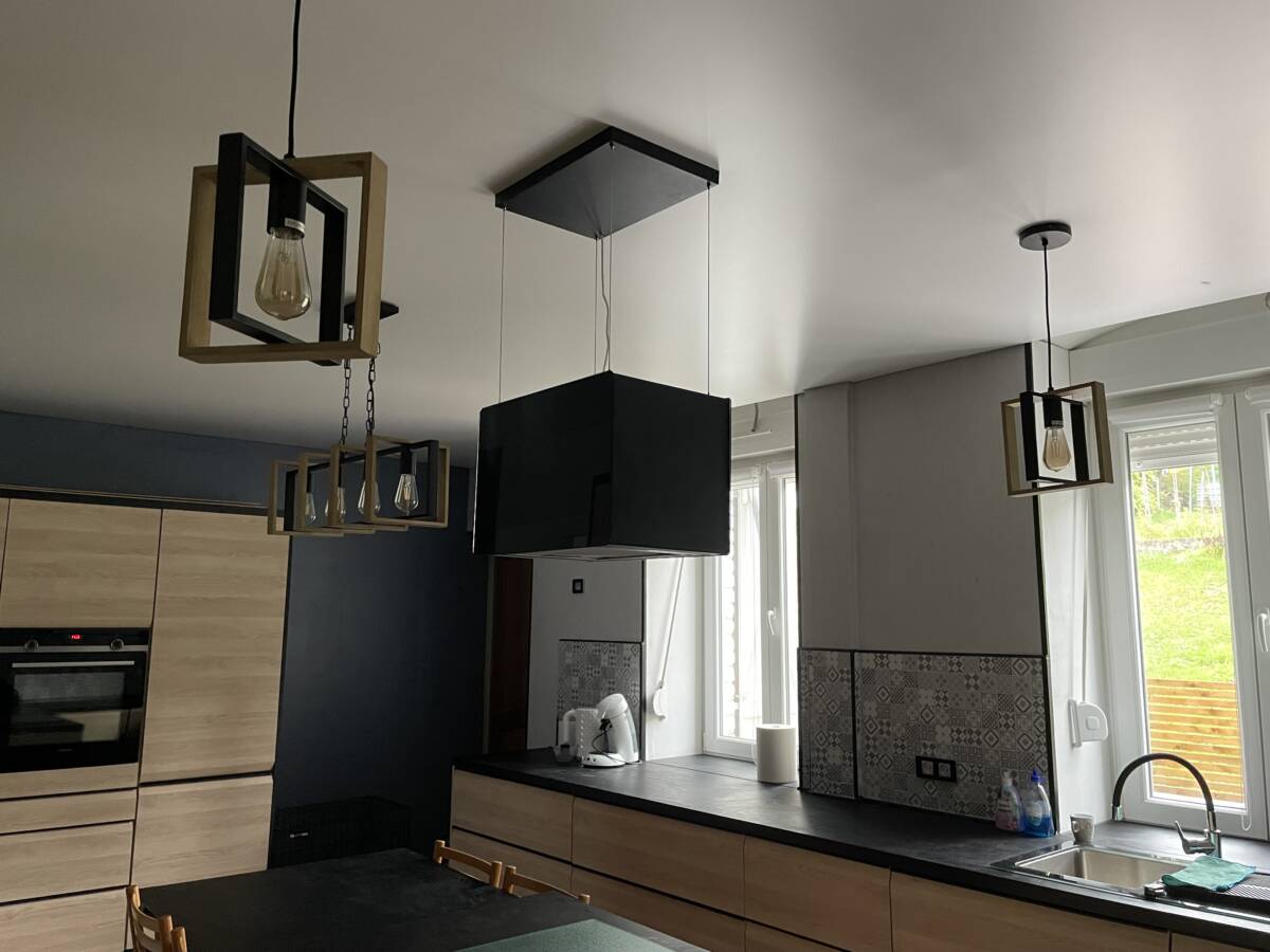 Nous soulignerons le bon gout de nos clients Algrangeois pour le choix des accessoires venant agrémenter notre beau plafond : une hotte élégante et des suspensions design.