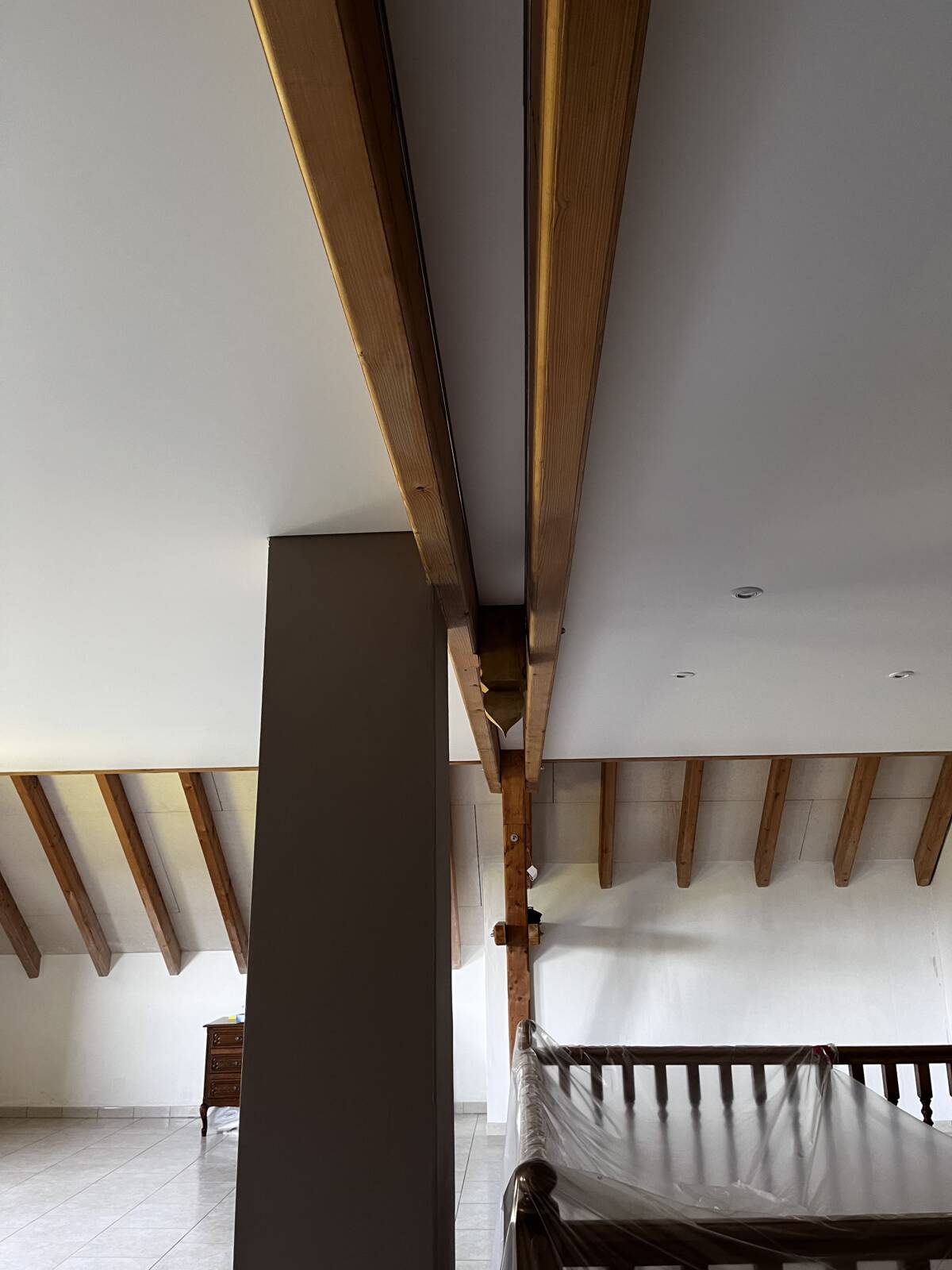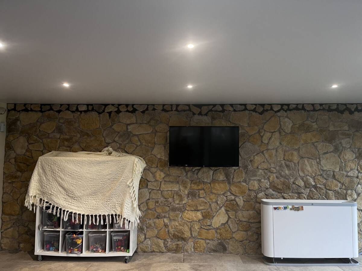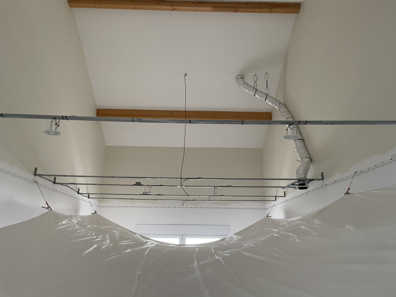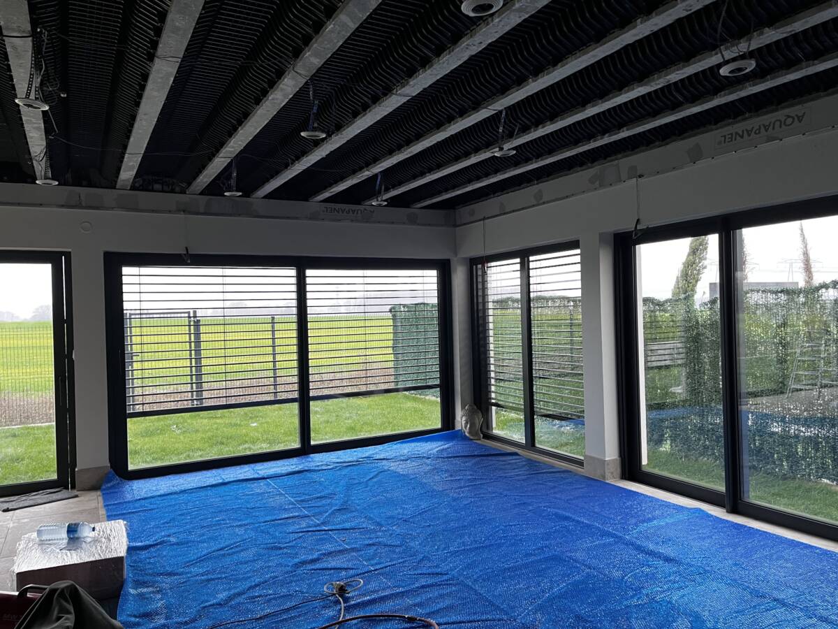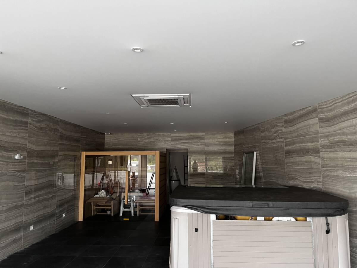 Pose de plusieurs toile blanc mat dans une pièce destiné a accueillir un spa et sauna avec spot et clim encastré